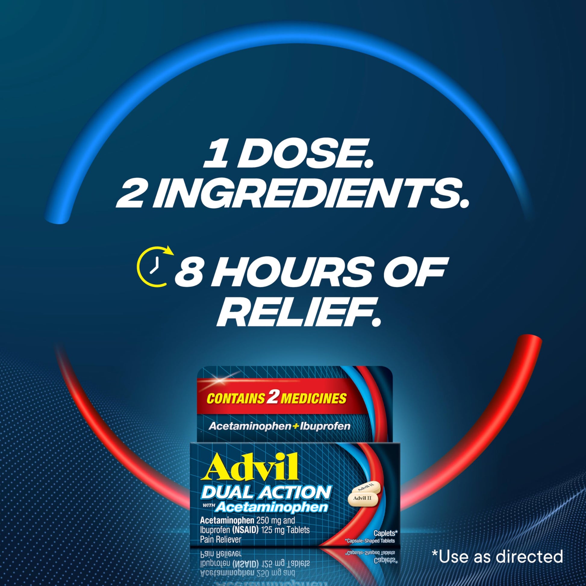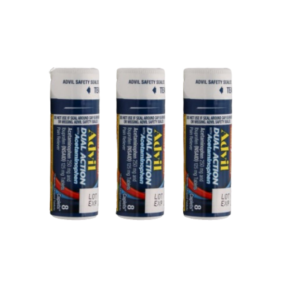 Tired of nagging aches and pains slowing you down? Introducing Advil Dual Action with Acetaminophen and Ibuprofen, your powerful ally against discomfort! This travel-size pack includes 3 bottles, each containing 8 caplets, perfect for your purse, gym bag, or travel kit. Get fast, effective 8-hour pain relief from headaches, muscle aches, backaches, and more.
