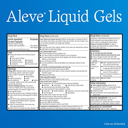 Aleve Liquid Gels aren't just for pain; they also temporarily reduce fever. Use them for relief from arthritis, muscular aches, backaches, toothaches, menstrual cramps, headaches, and even the common cold. Recommended by orthopedic surgeons for minor arthritic pain, Aleve provides trusted relief you can count on. Plus, the child-resistant packaging offers peace of mind. Expiration date: 05/2026. Don't miss out—add to your cart now! 🛒