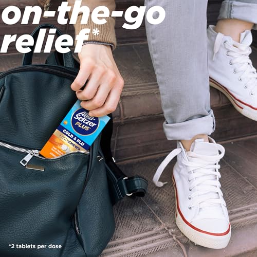 Don't let cold and flu symptoms stop your busy life! Alka-seltzer Plus Cold & Flu FizzyChews offer incredible convenience you can take anywhere. Forget searching for water; these FizzyChews are designed for instant relief, no water needed! Perfect for busy professionals, parents juggling schedules, or anyone who needs fast-acting medicine while traveling or commuting. Grab this on the go cold medicine for adults and stay prepared. Each pack contains 16 Orange Flavor chewables, making them a smart, travel-friendly essential. ✨ Easy to toss in your bag or keep in your desk!
