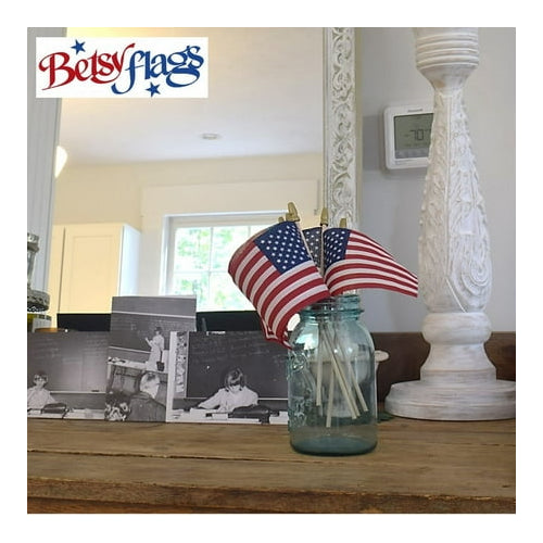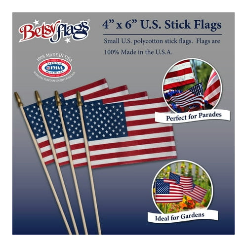 Get four quality American flags in one convenient pack! Made from durable poly cotton, these 4x6 stick flags by Betsy Flags are built to last for multiple uses. The four count offers excellent value, making it easy and affordable to decorate for any occasion or grab extras for friends and family. Ideal for busy shoppers and bargain hunters looking for a quick, easy, and reliable purchase. Add this 4-pack to your cart today and be ready for your next celebration!