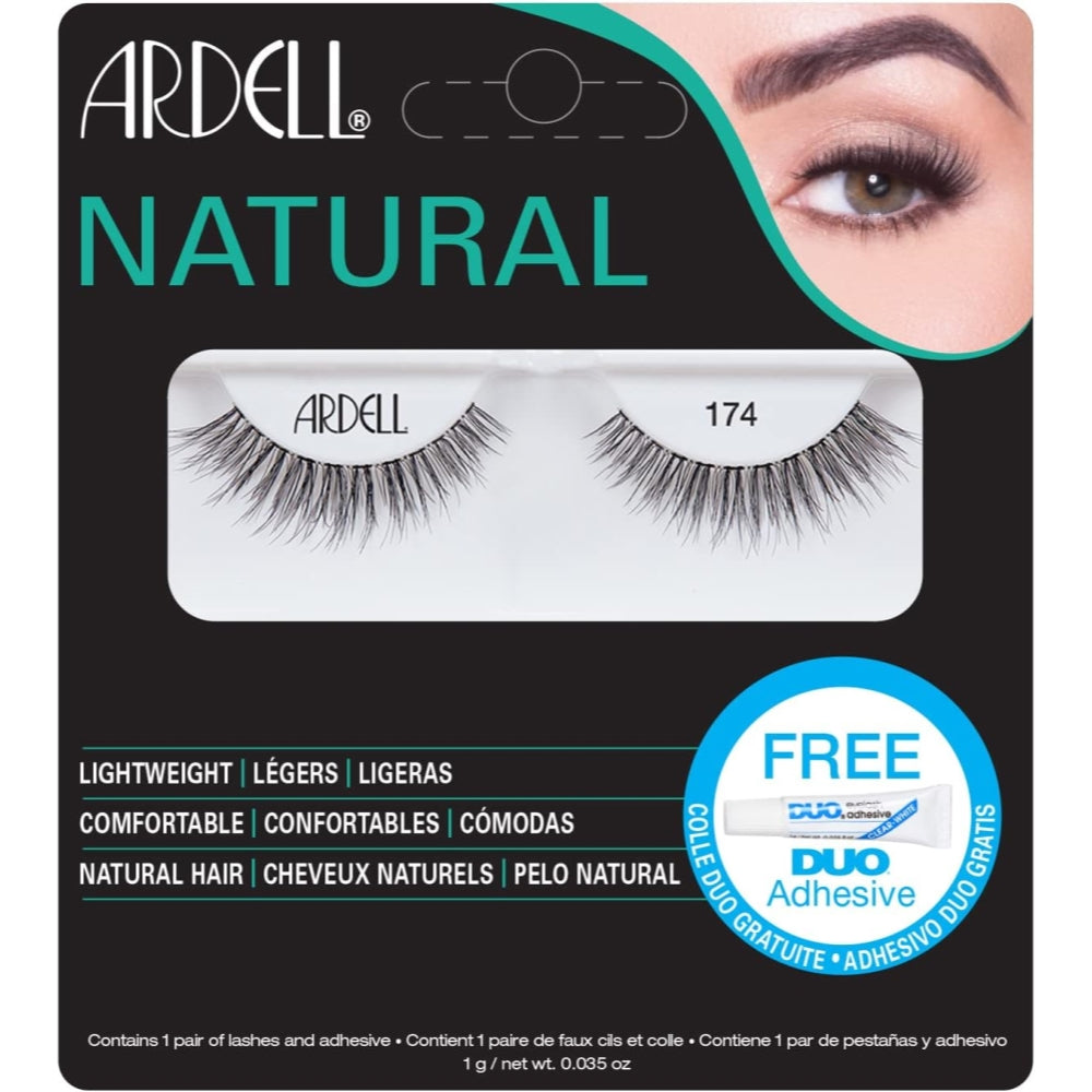 Ardell Natural 174 Lashes are made of the softest fibers and have a delicate, double layered curl ⢠Natural looking lashes ⢠Slightly longer on outer corner for sexy flared effect ⢠The softest, fine tapered fibers ⢠Invisiband®