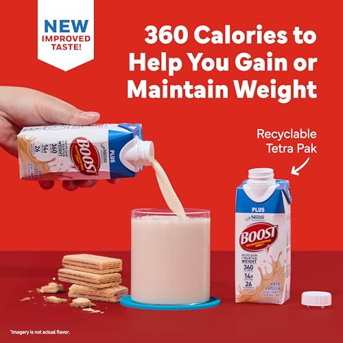 Looking for a convenient way to support your healthy weight goals? Discover BOOST Plus Ready to Drink Balanced Nutritional Drink in delightful Very Vanilla! Each 8 FL OZ bottle packs a powerful 360 calories and 14 grams of protein, making it an ideal choice for weight gain or maintaining a healthy weight. It's also 50% more calories than BOOST Original! Enjoy peace of mind knowing these nutritional shakes are gluten-free and contain no artificial colors or sweeteners. Perfect for busy lifestyles, ensuring you get the essential nutrients you need with every delicious sip. 💪