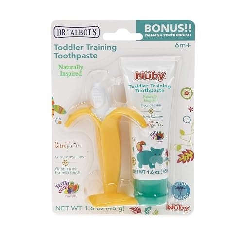 Introducing Dr. Talbot's Toddler Training Toothpaste, your secret weapon for stress-free oral hygiene! 🦷 Crafted with a naturally inspired formula featuring Citroganix, this toothpaste is fluoride-free, paraben-free, and completely safe to swallow, giving parents ultimate peace of mind. Bid farewell to brushing battles; the irresistible Tutti-Frutti flavor transforms teeth time into a fun routine your little one will love. It's the perfect way to encourage healthy brushing habits from as early as 6+ months, setting them up for a lifetime of bright smiles!