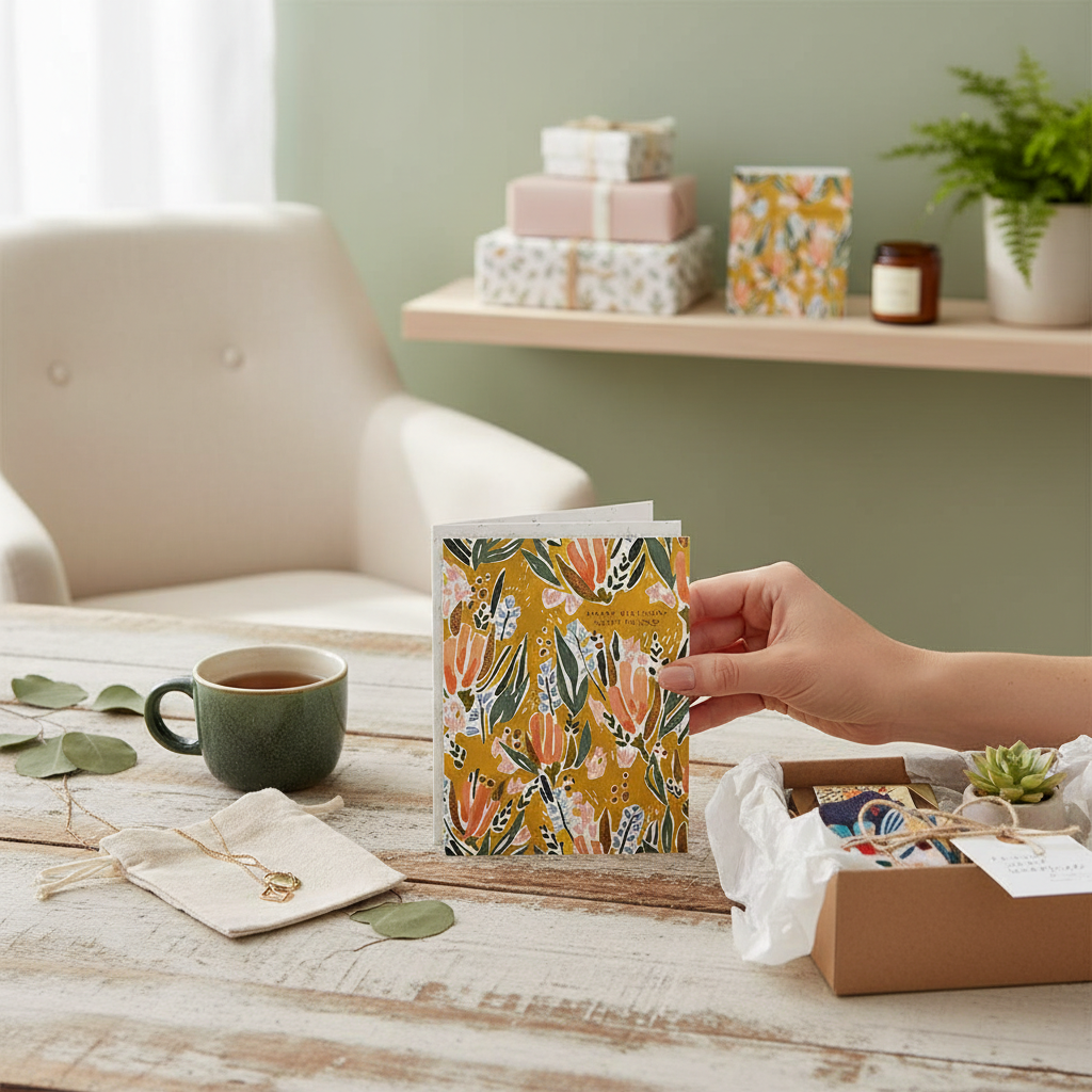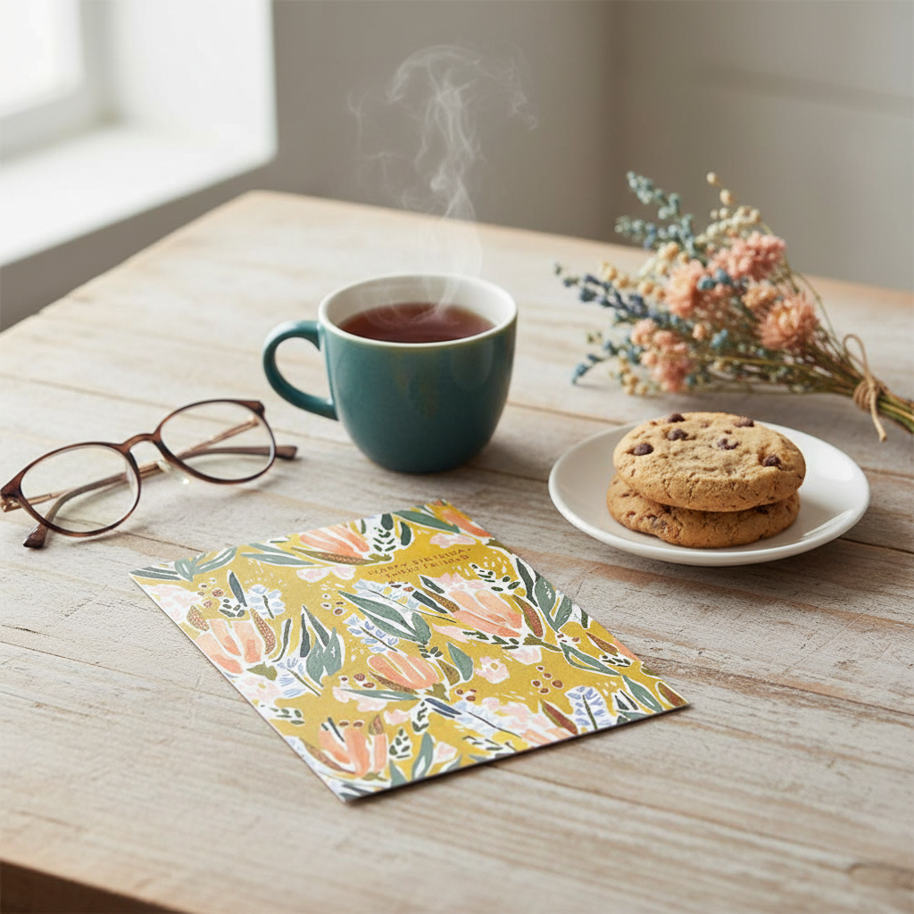 - Premium Artistic Design: Features a vibrant Sweet Friend Floral motif with a rich yellow background and delicate painted blooms.
