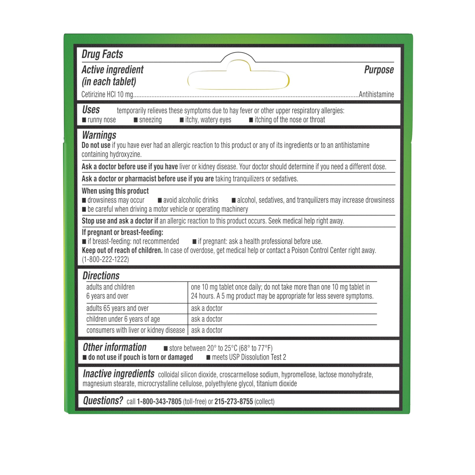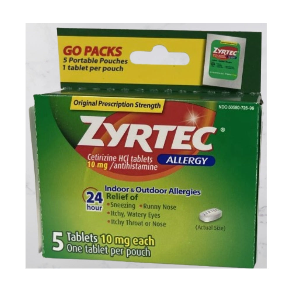 Tired of allergies slowing you down? π€§ Get powerful, 24-hour relief with Zyrtec Allergy Relief Tablets! This convenient pack contains 5 individually wrapped tablets, perfect for travel, work, or keeping in your bag. Each tablet contains 10 mg of Cetirizine HCl, a prescription-strength antihistamine that tackles your worst indoor and outdoor allergy symptoms. Say goodbye to runny noses, sneezing, itchy eyes, and that bothersome itchy throat! π ββοΈ Zyrtec provides fast-acting relief that starts working in just one hour, so you can get back to enjoying your day. Don't let allergies control you β take control with Zyrtec! πͺ